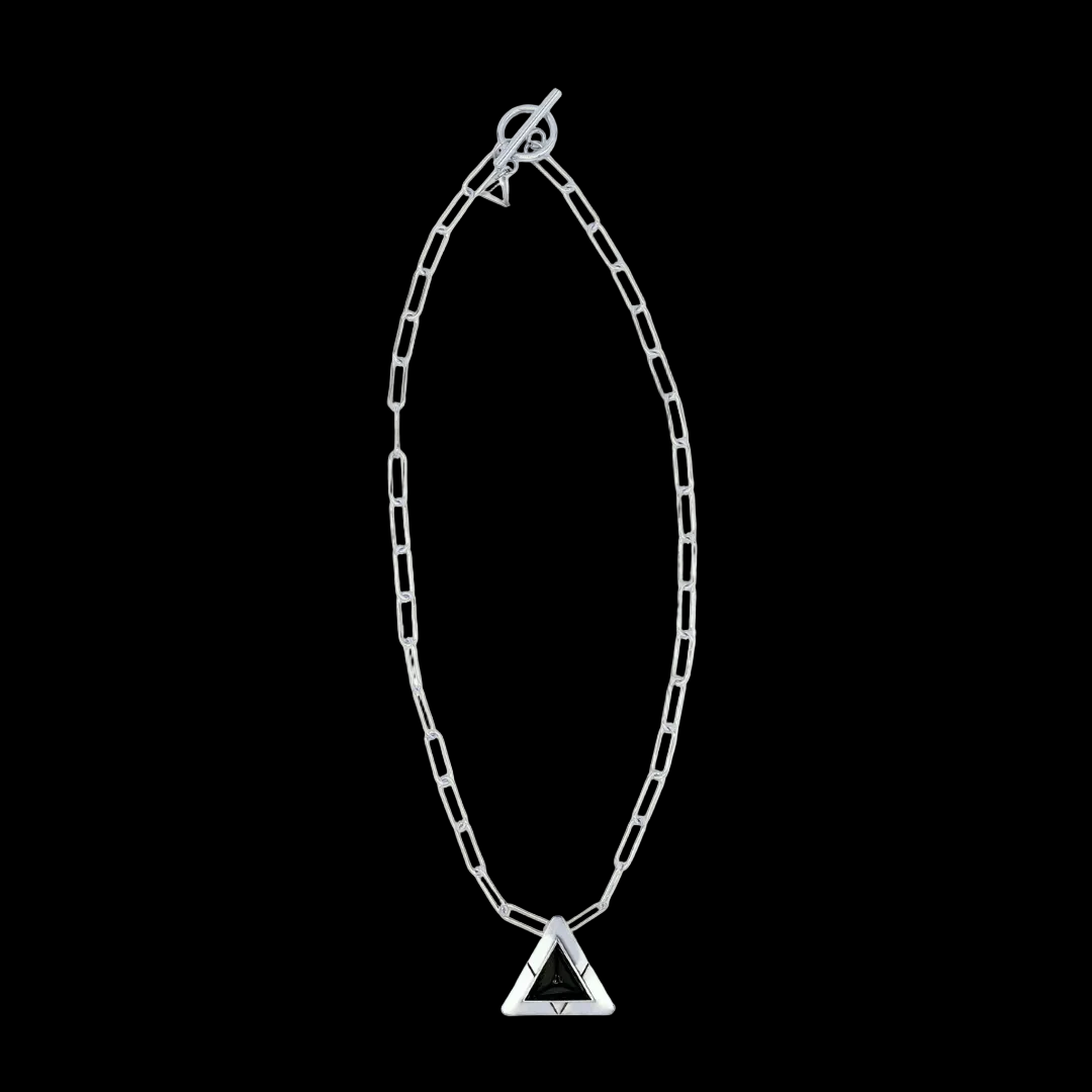 The DIPDHA Infinity Triangle Necklace. Our Infinity Chain is paired with a medium Crystal Triangle Slider Charm and an eye-catching toggle clasp. Stackable, elegant and unique.